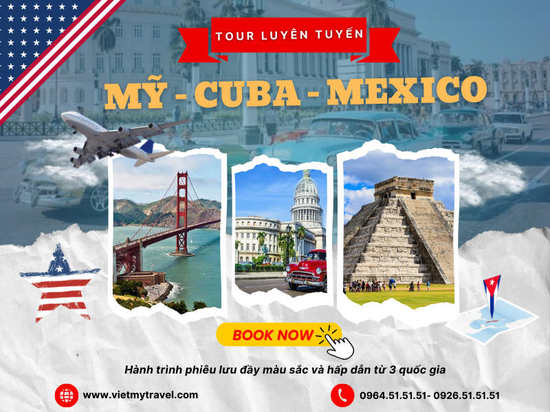 Du lịch Mỹ – Mexico – Cuba độc lạ cùng Vietmytravel. Những cảnh đẹp thiên nhiên kỳ diệu, văn hóa phong phú và lịch sử đa dạng là những điều khiến hành trình khám phá Mỹ – Mexico – Cuba trở thành một trải nghiệm tuyệt vời và không thể nào quên. Từ những cung đường đồi núi ở Mỹ tới những bãi biển trắng muốt ở Mexico và những con phố đầy màu sắc của Havana – Cuba, hành trình này sẽ đưa du khách qua những điểm đến đa dạng và đầy mê hoặc.