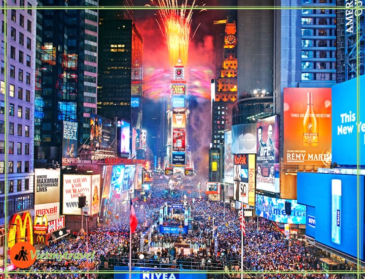 - Quảng trường thời đại (Time Square) – Quảng trường trung tâm thành phố New York rực rỡ với những ánh đèn màu và bảng quảng cáo.