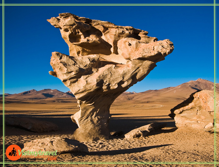 - Hồ muối Salar de Uyuni: Quý khách sẽ được tận mắt chiêm ngưỡng cánh đồng muối lớn nhất thế giới với diện tích 1500km vuông và chứa khoảng 10 tỷ tấn muối. Uyuni chính là nơi mà Neil Amstrong có thể nhìn thấy từ mặt trăng năm 1969. Nằm ở độ cao 3.656m so với mặt nước biển, rộng tới 10.582km và phẳng như một tấm gương. Vào mùa đông, nơi đây còn được ví von như một “thế giới trong gương” khi phản chiếu hoàn hảo ánh sáng mặt trời, in bóng mây trời trong xanh và những ngọn núi ngàn đời tĩnh lặng kỳ vĩ. Quý khách sẽ tha hồ chụp những tấm ảnh lạ mắt nhờ vào hiệu ứng phản chiếu, như có sức mạnh siêu nhiên lướt trên mặt hồ. Đoàn băng qua cánh đồng muối phủ một màu trắng miên man bất tận và các đụn muối nhỏ được vun đầy tựa như lâu đài cát và ghé thăm một nhà máy muối nhỏ.