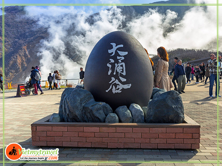 - Tham quan thung lũng Owakudani: Nơi này luôn tấp nập, náo nhiệt khách tham quan và có món đặc sản trứng đen may mắn “Kurotamago”. Ở thung lũng Owakudani có thần Jizo (Địa Tạng Bồ Tát) với tên gọi là “Enmei Jizo Bosatsu” – Người bảo vệ trẻ em và kéo dài tuổi thọ – được cho là do Kobo Daishi tạo ra vào thời Heian (794-1185), tương truyền rằng thần Jizo bảo khi ăn một quả trứng đen may mắn “Kurotamago” sẽ trường thọ thêm 7 năm nữa.