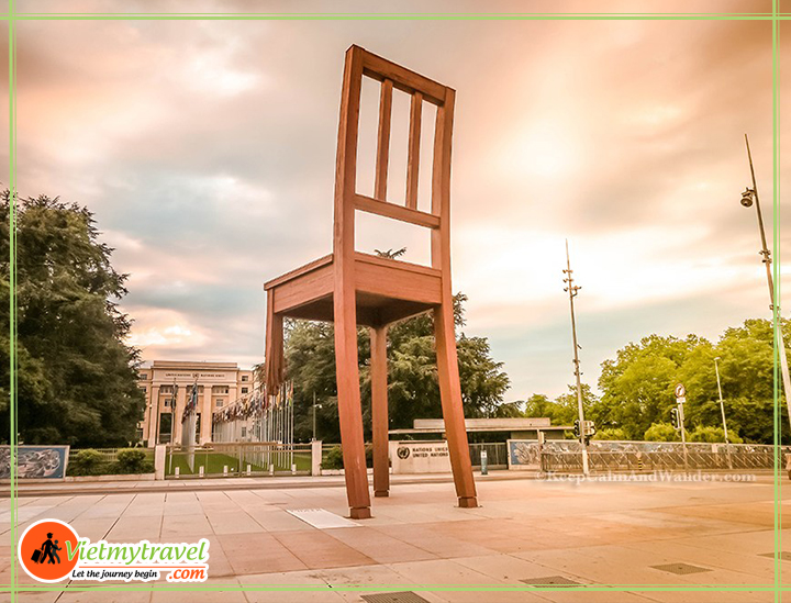 - Chiếc ghế cụt chân, điểm thu hút nhiều khách tham quan nhất của Geneva. Công trình điêu khắc bằng gỗ này được đặt tại Quảng trường Các quốc gia trong khuôn viên Trụ sở Liên Hiệp Quốc tại Châu Âu. Ý nghĩa Broken Chair – Chiếc ghé cụt chân là phản đối việc sử dụng mìn và bom bi sát thương, vũ khí và chiến tranh luôn phủ “bóng ma” lên sự phát triển của nền văn minh nhân loại.